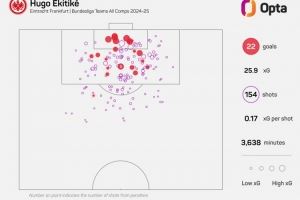 据Opta统计,埃基蒂克上赛季各赛事打进22球,他是同期进球最多的五大联赛U23球员。